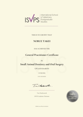 院長がISVPSによるGPcert in Veterinary Dentistry & Oral Surgeryを修了しました NEW