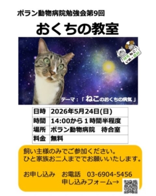 5/24(日)おくちの教室開催します。 NEW 2026年4月19日 5月24日におくちの教室を開催いたします。 今回はテーマが「ねこのおくちの病気」ですので 猫ちゃんの飼い主さん対象です。お申し込みはお電話か お申し込みフォームよりお願いいたします。