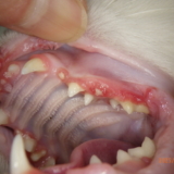 外部吸収とは猫ですと破歯細胞性吸収病巣(はしさいぼうせいきゅうしゅうびょうそう)というのが有名で、歯の根元から歯が吸収され、骨に置換される病態です。犬では人の分類に基づき7つのパターンの外部吸収、内部吸収があるとされております。今回は外部表面吸収と呼ばれるもので、歯周炎などがなければそのまま経過観察でも良かったのですが、このように歯槽骨の喪失により歯の溶けた部分が露出している場合は、痛みを伴うため抜歯が適応と考えられました。