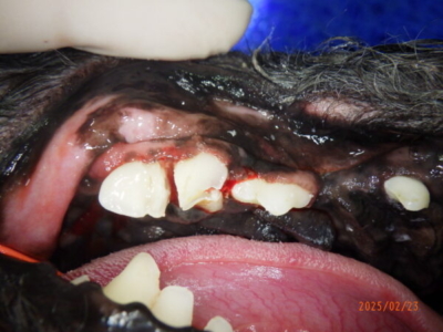 があげられます。今回はわんちゃんが11歳で初期の心臓病もあることから、治療として一度で済む抜歯を行うこととしました。また後臼歯も歯周病のステージも重度であり抜歯しました。
