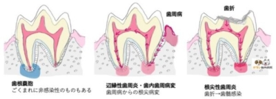 結局のところ、歯の根元に感染が及ぶことが原因となります。歯がかけて、神経が出てしまいそこから神経が感染を起こし歯の根元まで影響があるか、歯周病が進行し歯の根元まで感染を起こすか、という感じです。