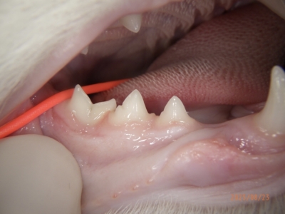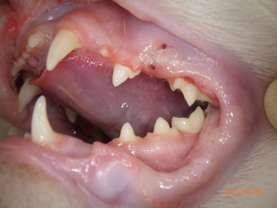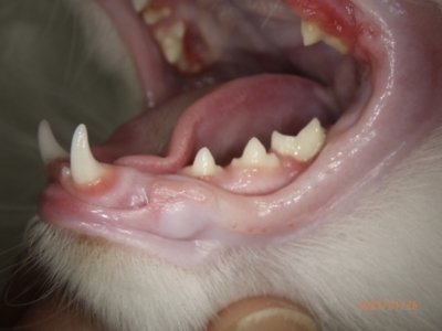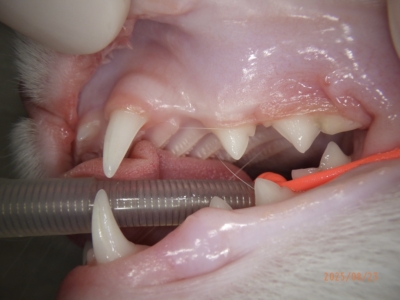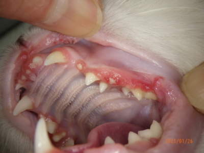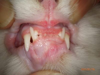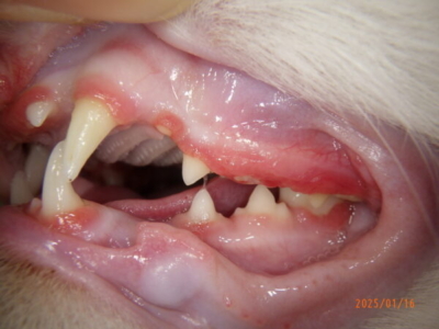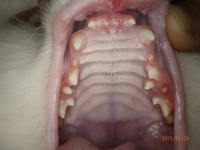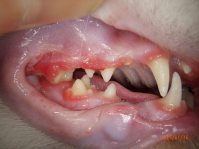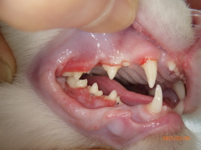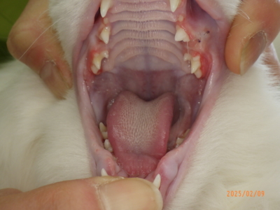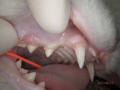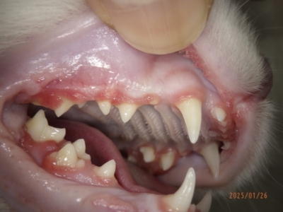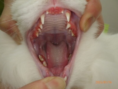 とまあ、前置きが長くなりましたが、今回の話は実は乳歯遺残ではありません。生後10ヶ月のオス猫ちゃん。かかりつけ医にて去勢手術時に乳歯が残っていることと歯肉が赤いことが指摘されました。