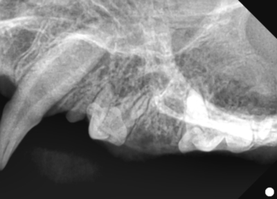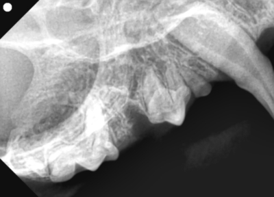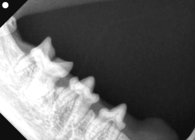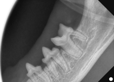 当院にて初診時、お口を確認するとまず、歯肉が赤くモリモリしていることがわかります。そして、奥の方は赤く腫れていないので、幸い口内炎にはなっていないようです(口内炎は喉のほうまで赤く腫れます)。歯は確かに本数は多いのですが、乳歯にしてはそれぞれの歯がしっかりしています。これらのことから、若齢猫の歯肉増殖症と、過剰歯の存在と推測しました。これらの病態の説明は後述しますが、いずれにしろ肉眼のみでの検査では診断も難しいため、全身麻酔下での歯科レントゲンを用いた精査、また歯肉の盛り上がった部位は一部採取して病理検査に提出することにしました。