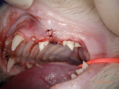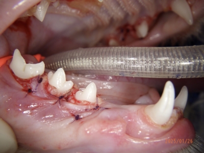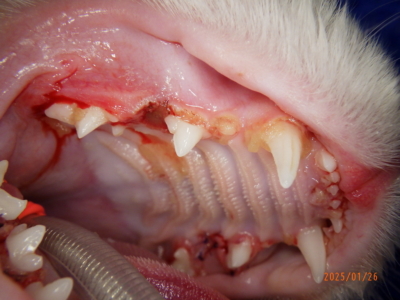 左下顎は中央に重なって生えている過剰歯があります。レントゲンで確認しても、乳歯ではなく永久歯と考えられました。これらは過剰歯と呼ばれ、通常より本数が多く歯が生えてきます。かみ合わせが悪くなり、また歯間が狭くなり歯垢がつき、歯周病になりやすいです。そのため、不必要と思われる歯を抜歯しました。また、歯肉の増殖している部分を一部切り取り病理検査用の検体とし、それ以外の部分はメスで切除し正常に近い歯肉の形状に近づけました。