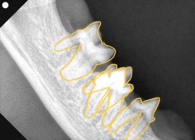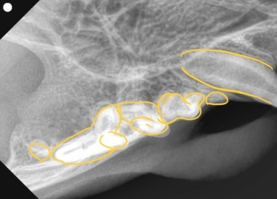 なにがなにやらわからないと思い、黄色ラインで歯をなぞりました。右上顎です。中央に過剰な歯があり、回転して生えています。