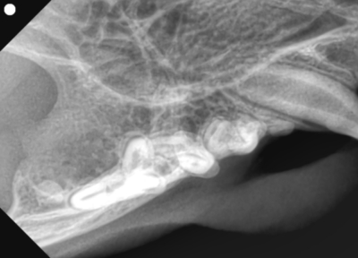 当院にて初診時、お口を確認するとまず、歯肉が赤くモリモリしていることがわかります。そして、奥の方は赤く腫れていないので、幸い口内炎にはなっていないようです(口内炎は喉のほうまで赤く腫れます)。歯は確かに本数は多いのですが、乳歯にしてはそれぞれの歯がしっかりしています。これらのことから、若齢猫の歯肉増殖症と、過剰歯の存在と推測しました。これらの病態の説明は後述しますが、いずれにしろ肉眼のみでの検査では診断も難しいため、全身麻酔下での歯科レントゲンを用いた精査、また歯肉の盛り上がった部位は一部採取して病理検査に提出することにしました。