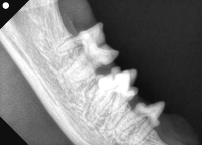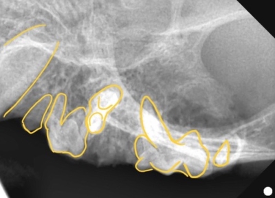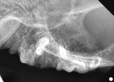 左下顎は中央に重なって生えている過剰歯があります。レントゲンで確認しても、乳歯ではなく永久歯と考えられました。これらは過剰歯と呼ばれ、通常より本数が多く歯が生えてきます。かみ合わせが悪くなり、また歯間が狭くなり歯垢がつき、歯周病になりやすいです。そのため、不必要と思われる歯を抜歯しました。また、歯肉の増殖している部分を一部切り取り病理検査用の検体とし、それ以外の部分はメスで切除し正常に近い歯肉の形状に近づけました。