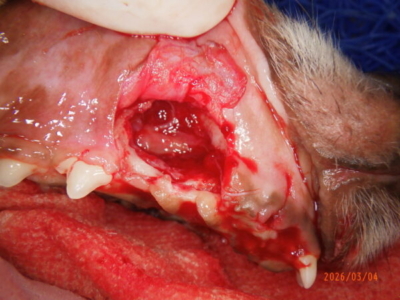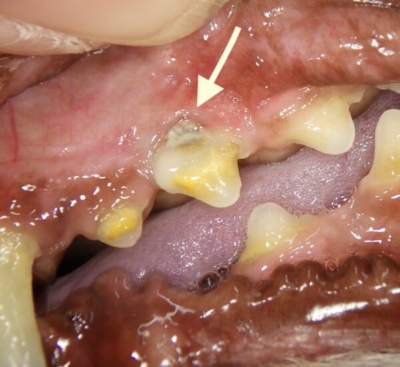 しかしよく観察すると、左上顎の第二前臼歯の歯肉が上がって根っこの部分が見えていました。(矢印部分)。この場所は歯根が鼻腔に近いため、歯周病が進行し歯の根元まで骨が失われると、鼻腔につながりかねません。その状態を口腔鼻腔ろうと言います。