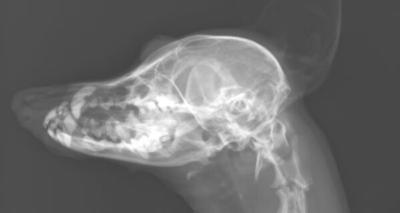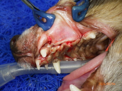 基礎疾患がありシニアの子ではありましたが、歯周病は経過観察しても治るというものではありません。別日に全身麻酔下で歯科レントゲン、口腔内精査を行い歯石除去、抜歯などを検討しました。術前検査の頭部レントゲン検査では、上顎犬歯に欠損があることもわかりました。こちらも手術中に確認することとしました。