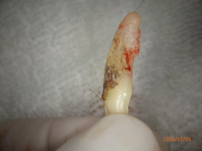 レントゲンで確認できた欠損部が犬歯に認められた。外部吸収と考えられる