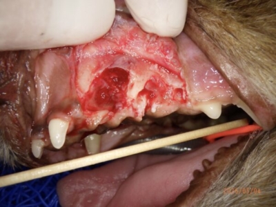 抜歯し、膿や肉芽を切除。奥に鼻腔が見える