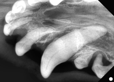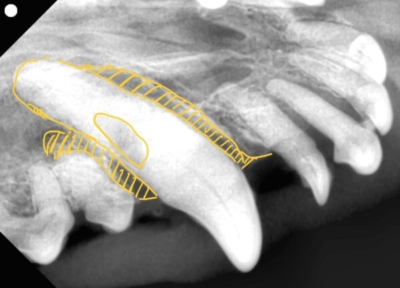 歯科レントゲンでも犬歯の一部に欠損があるのがわかりますね。これは頭部レントゲンで撮影した部分と一致します。