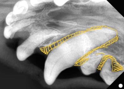 黄色斜線部が歯周病で周りの骨が溶けてしまっている状態。口腔鼻腔ろうになっていた。