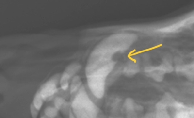 先ほどの頭部の拡大図。黄色矢印の位置で犬歯に一部虫歯のような欠損部が。